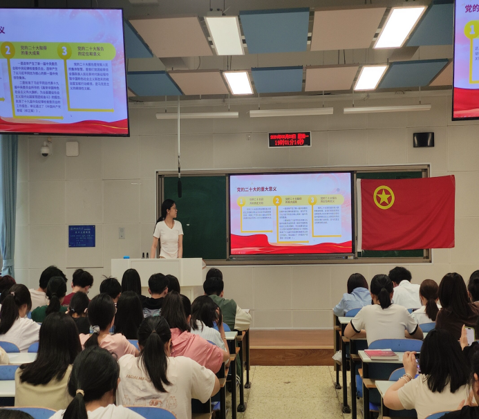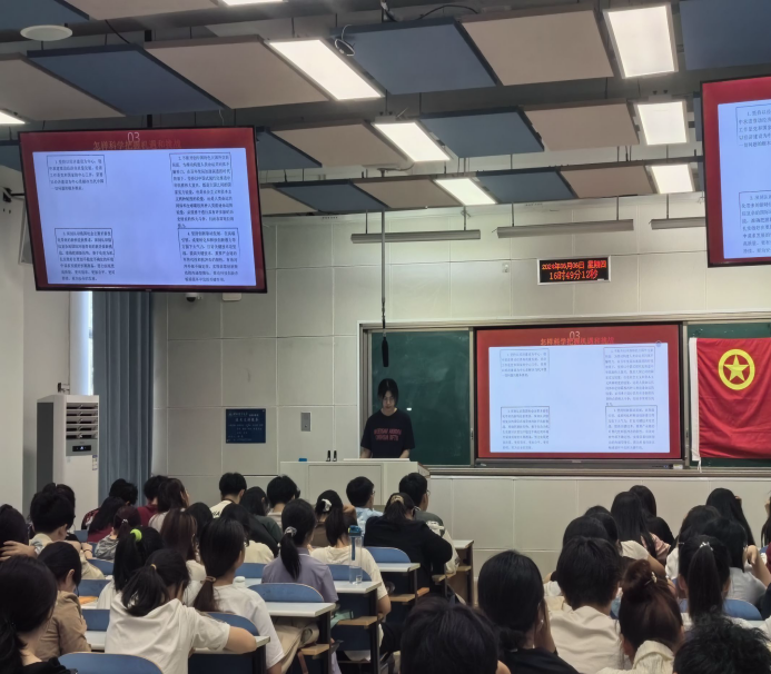 在第三节课“书写强国建设民族复兴的壮丽美丽篇章—学习习近平新时代中国特色社会主义思想及党的二十大精神”中,团委宣传部闫雨菲同学深入解读了习近平新时代中国特色社会主义思想和党的二十大精神的精髓要义,引导同学们坚定理想信念,积极投身强国建设和民族复兴的伟大事业中。