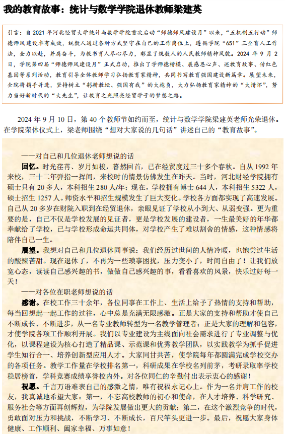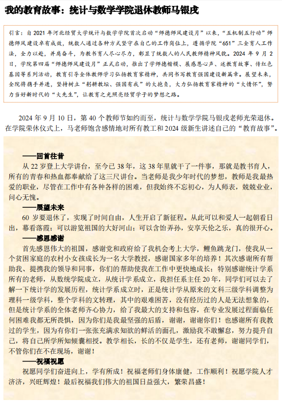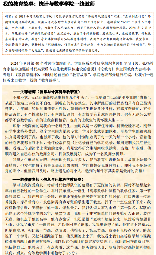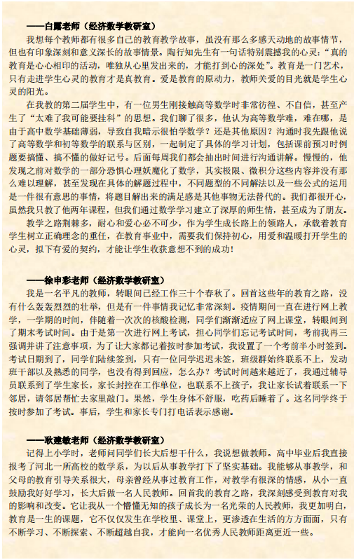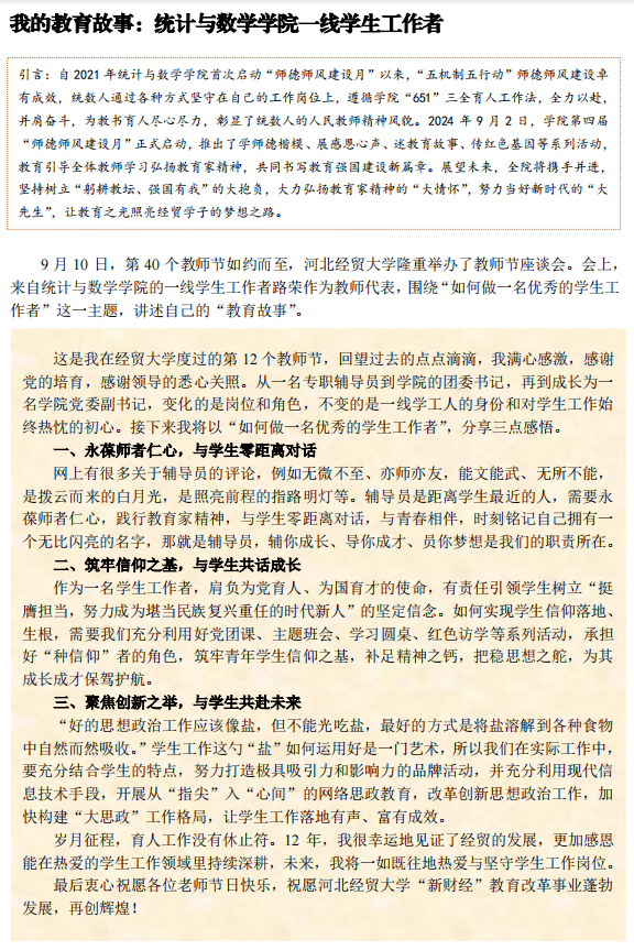 自2021年世界杯体育官方网站首次启动“师德师风建设月”以来,“五机制五行动”师德师风建设卓有成效,统数人通过各种方式坚守在自己的工作岗位上,遵循学院“651”三全育人工作法,全力以赴,并肩奋斗,为教书育人尽心尽力,彰显了统数人的人民教师精神风貌。2024年9月2日,学院第四届“师德师风建设月”正式启动,推出了学师德楷模、展感恩心声、述教育故事、传红色基因等系列活动,教育引导全体教师学习弘扬教育家精神,共同书写教育强国建设新篇章。展望未来,全院将携手并进,坚持树立“躬耕教坛、强国有我”的大抱负,大力弘扬教育家精神的“大情怀”,努力当好新时代的“大先生”,让教育之光照亮经贸学子的梦想之路。