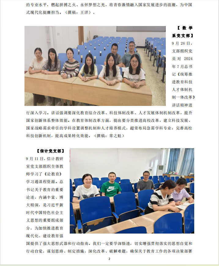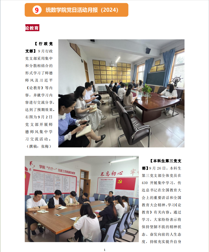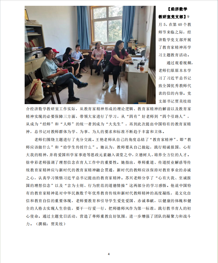 【经济数学教研室党支部】9月5日,在第40个教师节来临之际,经济数学党支部开展了教育家精神再学习主题教育活动。