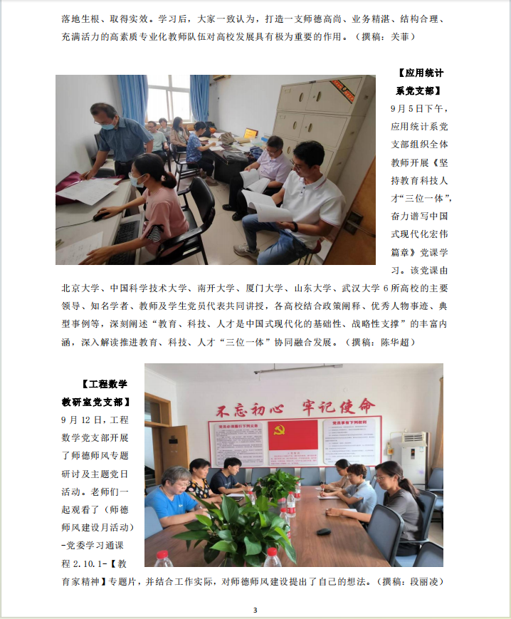 【工程数学教研室党支部】9月12日,工程数学党支部开展了师德师风专题研讨及主题党日活动。老师们一起观看了(师德师风建设月活动)-党委学习通课程2.10.1-【教育家精神】专题片,并结合工作实际,对师德师风建设提出了自己的想法。(撰稿:段丽凌)