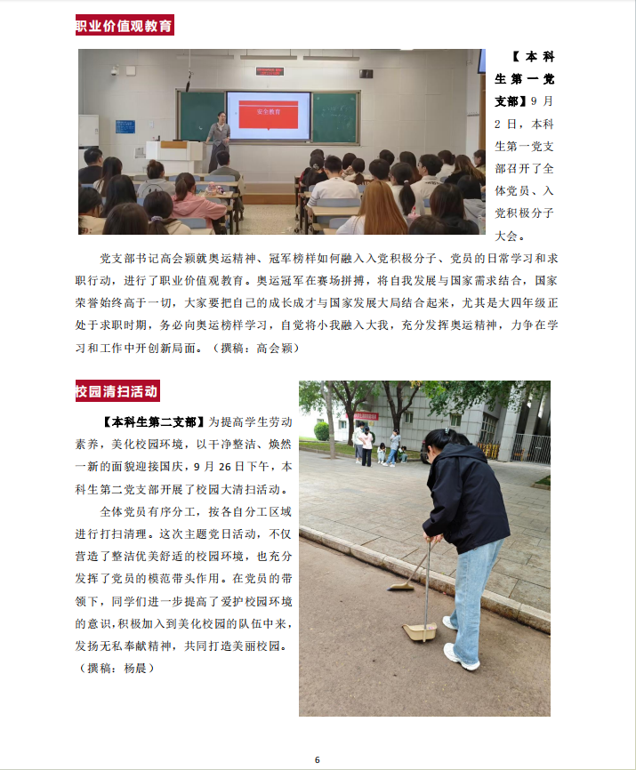 【本科生第二支部】为提高学生劳动素养,美化校园环境,以干净整洁、焕然一新的面貌迎接国庆,9月26日下午,本科生第二党支部开展了校园大清扫活动。