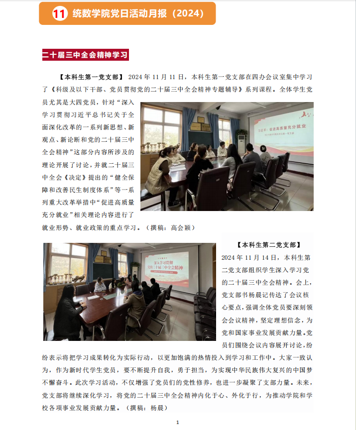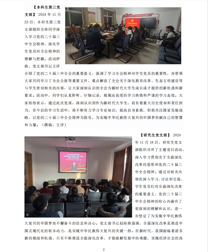 【行政党支部】2024年11月,行政党支部按照校党委和院党委的安排及要求,分散或集中学习了二十届三中全会精神、《论教育》等内容。11月11日,支部全体党员进行了集中学习和讨论。(撰稿:张梅)