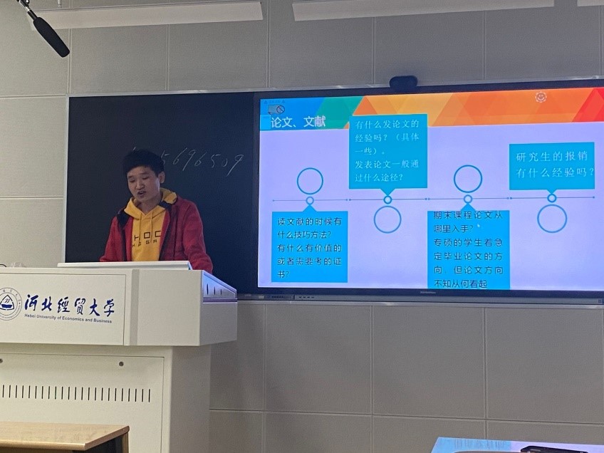 活动开始,世界杯官网研究生会主席韩正涛学长对本期学术沙龙进行了介绍。活动主要由学术答疑和游戏破冰两个环节组成。第一环节是为2020级研究生解答关于学习、生活、毕业、就业等方面的疑问,其目的是使2020级新生尽快适应研究生生活,并对今后的学习和生活有初步地了解。第二环节是游戏破冰。研究生自愿组队进行游戏,增进研究生之间互相了解的机会,促进研究生之间的了解。