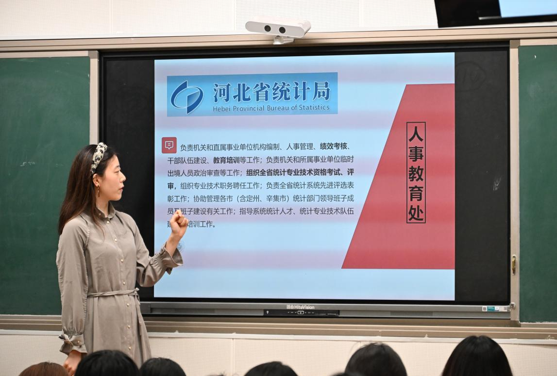 在第一板块,曾于河北省统计局、水滴科技等单位实习的同学依次登台,围绕岗位能力需求、日常实操细节、参与项目要点等展开陈述,辅以典型案例与成长感悟。他们一致提到,将课堂所学迁移至数据采集、清洗、建模及报告撰写全链条,既需要严谨的数据思维,也离不开高效沟通与团队协作。