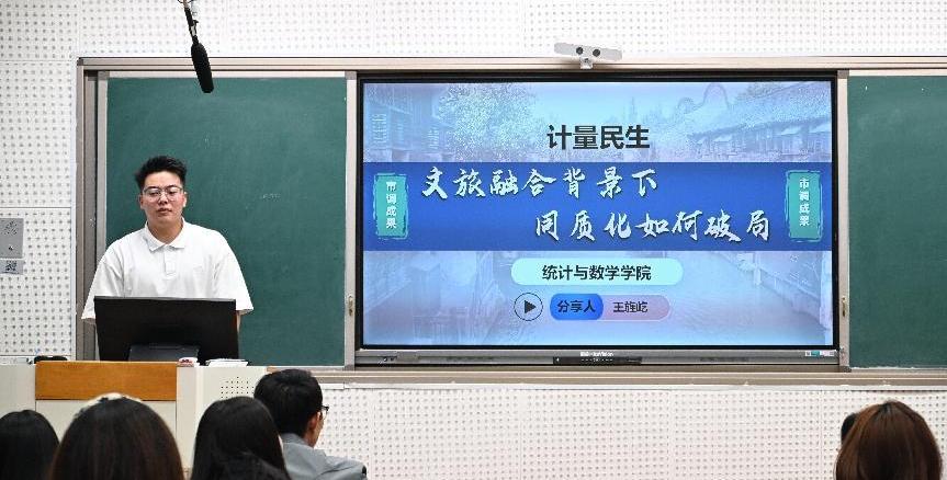 2024级应用统计专业吴文凯代表他们市调大赛国奖团队,汇报项目《“心理有偏向,正定有方向”——心理账户视角下Z世代对古城目的地选择偏好及可持续发展研究》。他特别提醒:选题既要回应社会热点,也要寻找学术切口;统计方法须多元,样本量须充足,后期稳健性检验亦不可或缺。