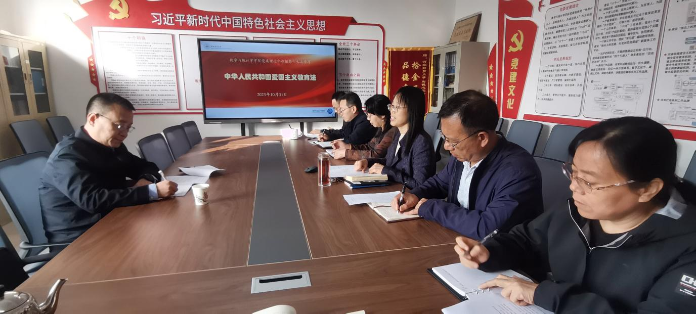 10月31日上午,数学与统计学学院党委理论学习中心组在四办430党建活动室进行专题学习研讨,认真学习2023年10月24日第十四届全国人民代表大会常务委员会第六次会议表决通过的《中华人民共和国爱国主义教育法》。校党委常委、副校长田学斌参加中心组学习并作指导讲话,学院全体班子成员作重点发言,正处级辅导员赵春果应邀参加。这是今年以来学院党委开展的第十七次理论学习中心组集体学习。