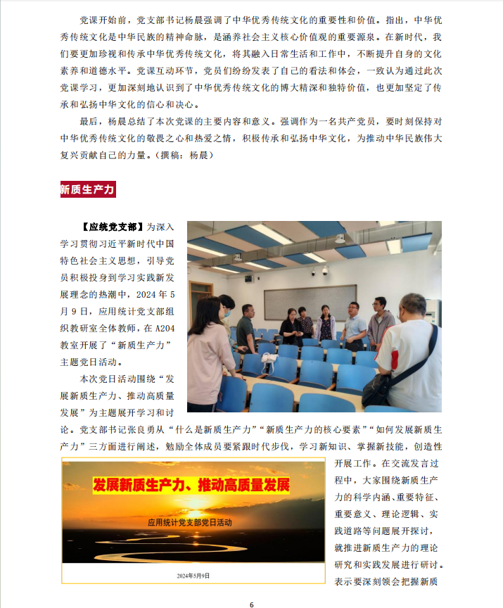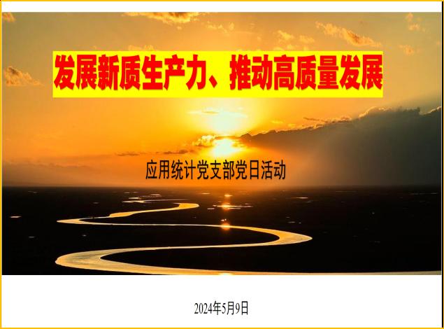 【应统党支部】为深入学习贯彻习近平新时代中国特色社会主义思想,引导党员积极投身到学习实践新发展理念的热潮中,2024年5月9日,应用统计党支部组织教研室全体教师,在A204教室开展了“新质生产力”主题党日活动。