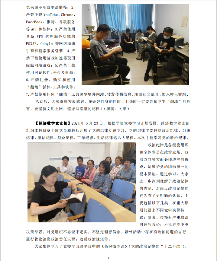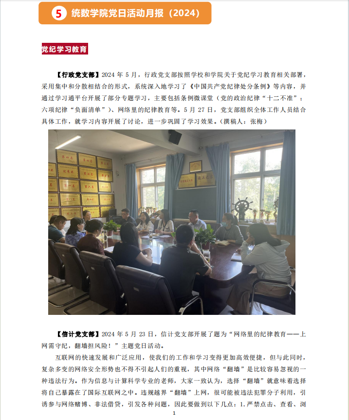 【信计党支部】2024年5月23日,信计党支部开展了题为“网络里的纪律教育——上网需守纪,翻墙担风险!”主题党日活动。