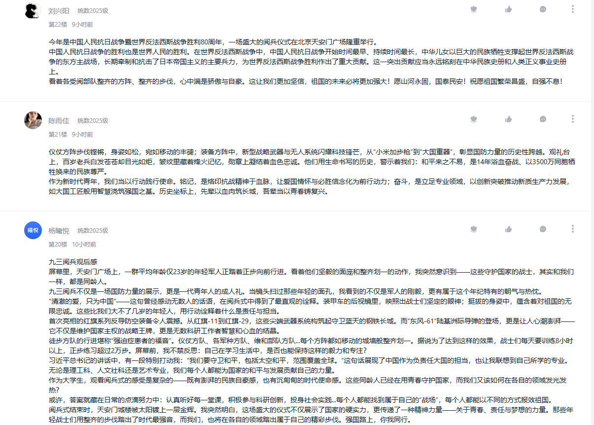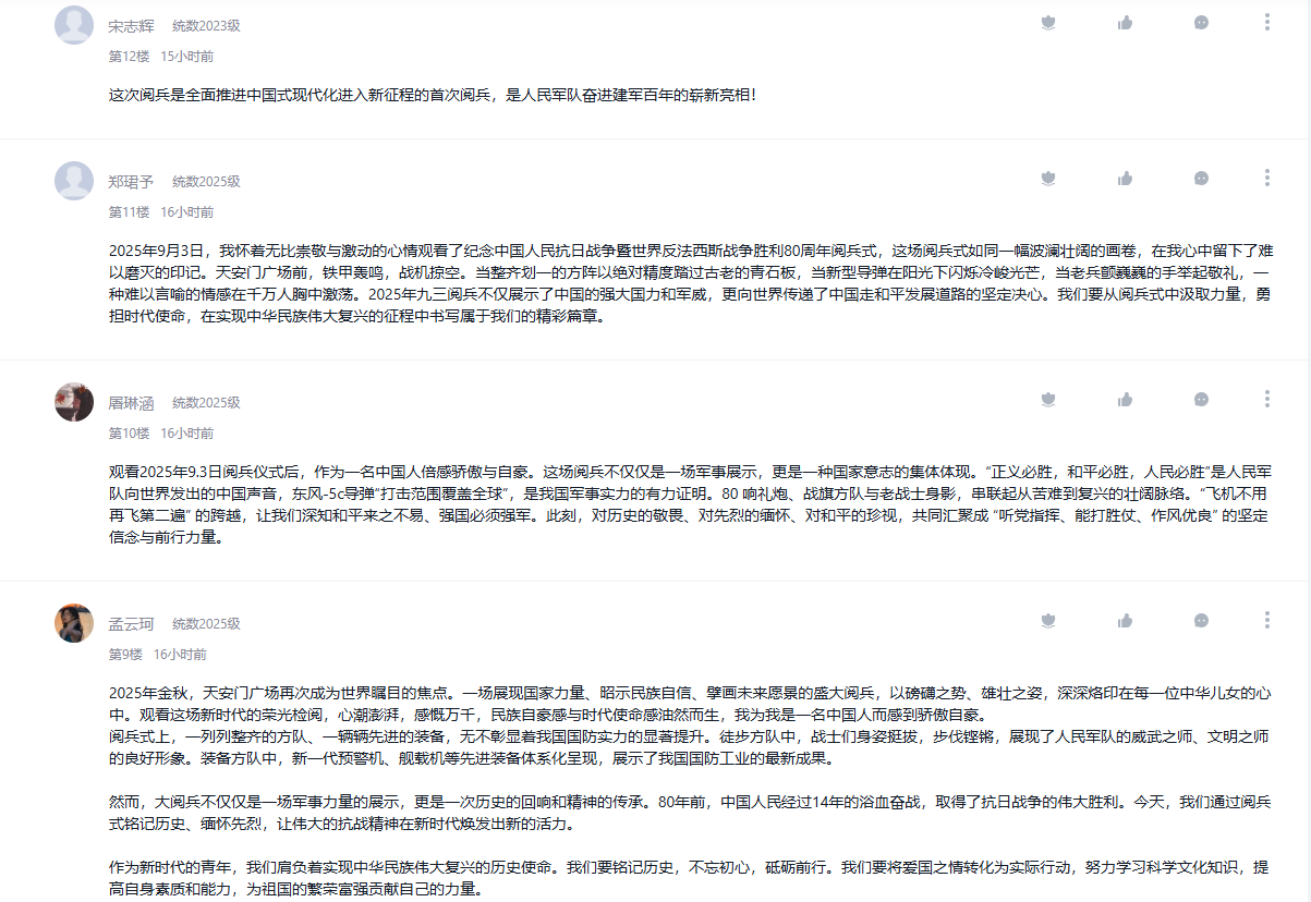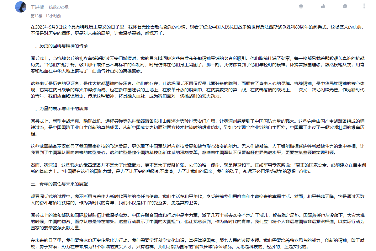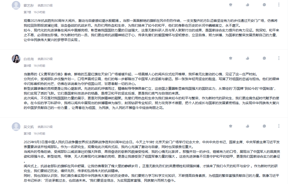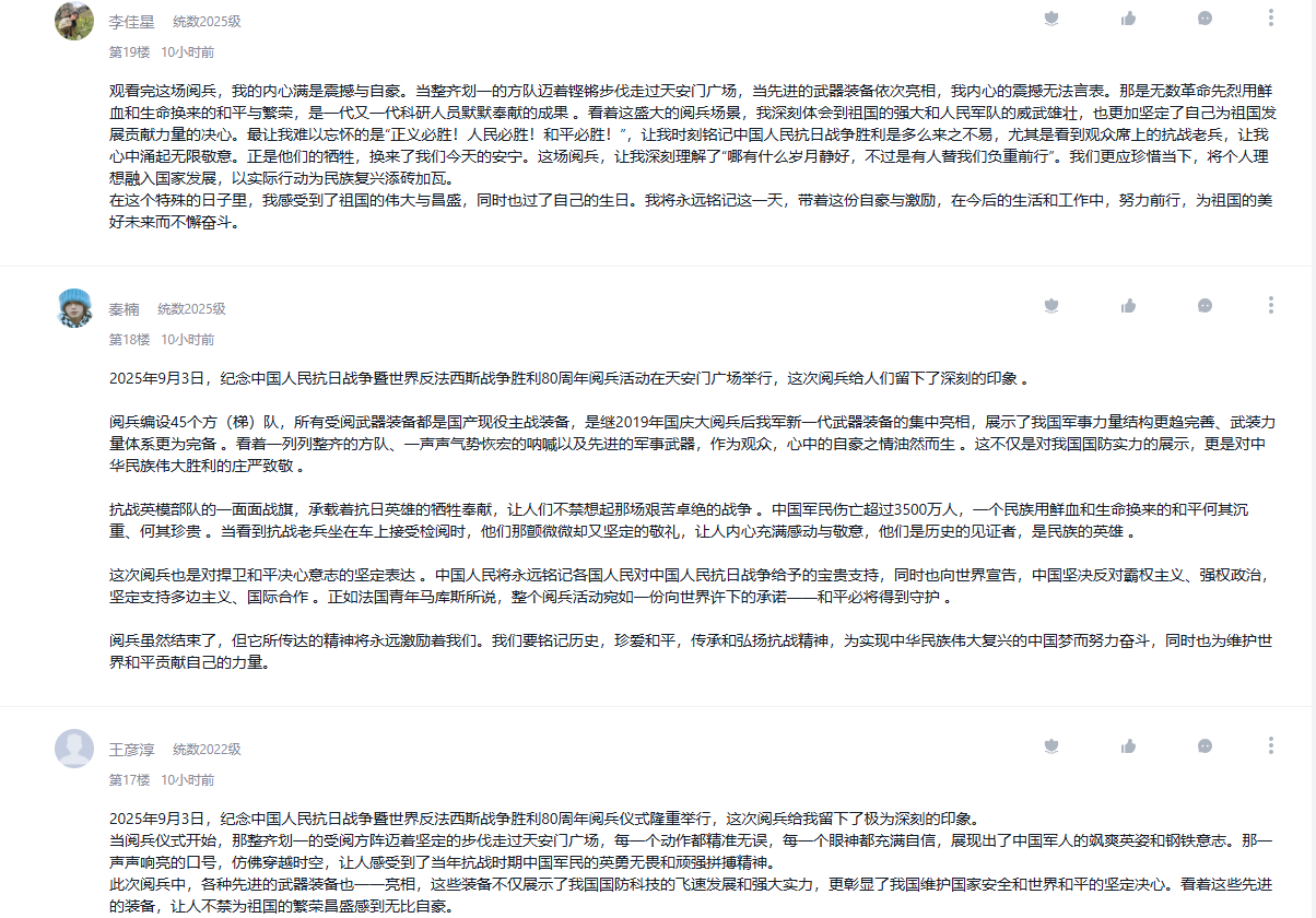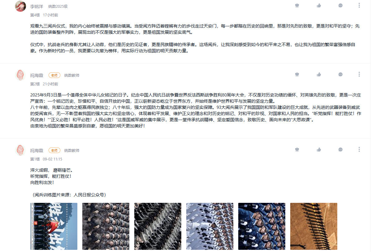 9月3日,纪念中国人民抗日战争暨世界反法西斯战争胜利80周年大会在北京隆重举行。学院把观看纪念大会和阅兵仪式作为一堂思政大课,纳入2025级新生军事训练、课堂教学、党团支部和班级的重要活动内容,并在《向学统数》学习通党建课程平台开设交流专区,师生通过各类平台观看直播盛况,引起热烈反响。