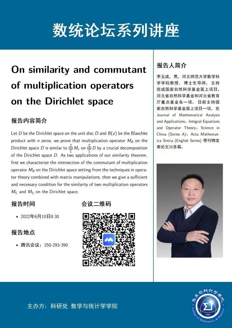 报告人简介:李玉成,河北师范大学数学科学学院教授,博士生导师。主持完成国家自然科学基金面上项目、河北省自然科学基金和河北省教育厅重点基金各一项。目前主持国家自然科学基金面上项目一项。在Journal of Mathematical Analysis and Applications、Integral Equations and Operator Theory、Science in China (Series A)、Acta Mathematica Sinica (English Series)等刊物发表论文20多篇。