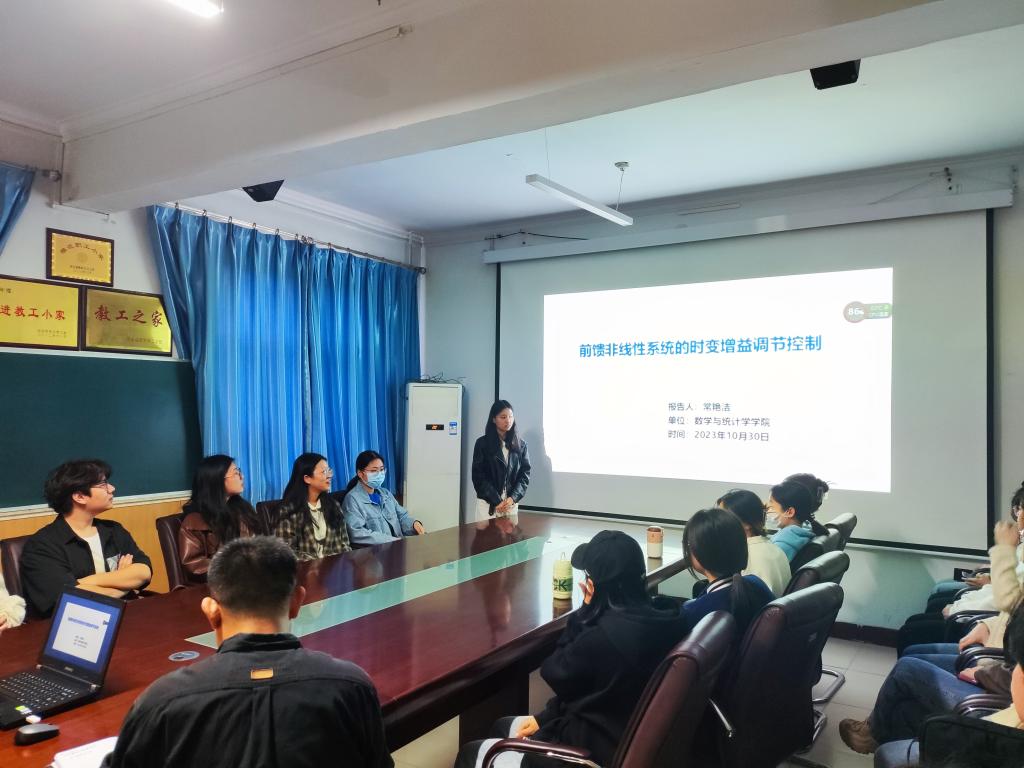 10月30日下午,世界杯体育官方网站“双百论坛”暨数统论坛系列讲座在四办405会议室举行。数统学院常艳洁老师作题为“前馈非线性系统的时变增益调节控制”的学术报告。学院领导、相关专业教师及研究生参加,副院长闫亮主持报告会。