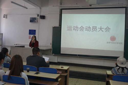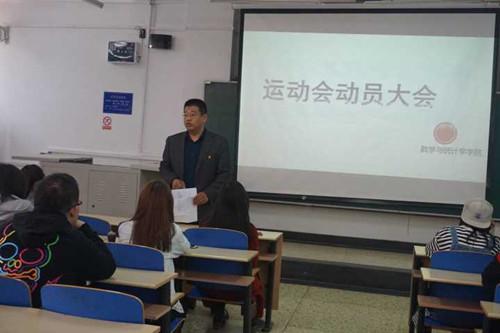 4月12日下午,数学与统计学学院在B101召开了运动会动员大会,学院党委副书记刘益星,团委书记杨晨出席了本次大会并发表讲话,所有运动员及后勤服务人员参加了本次大会。