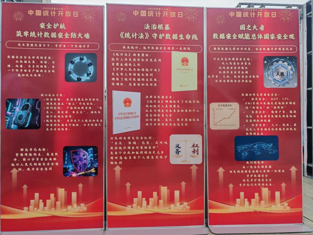 活动现场,学院以“数据赋能总体国家安全观”为主题设置了相应展区,展示“国之大者:数据安全赋能总体国家安全观”“安全护航:筑牢统计数据安全防火墙”“法治根基:《统计法》守护数据生命线”等内容;现场还设置了“红色统计史”“统计开放日沿革”“1%人口抽样调查”“第四次全国农业普查”展区,以图文并茂的形式展示统计事业的发展历程和重要成果。展区吸引了众多学生驻足观看,咨询台前专业人士与学子们进行面对面交流,现场气氛热烈,互动频繁。学生们通过现场互动,深刻体会到统计数据背后的责任与使命,纷纷表示要学好专业知识,加强实践锻炼,为统计事业长远发展注入经贸力量。