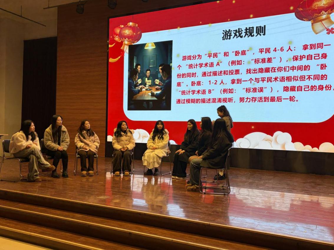 “统计版”谁是卧底是本次活动最具学科特色的环节。游戏选取如“标准差与标准误”等成对统计学术语作为词库。平民需通过精准描述术语特征识别卧底,卧底则要巧妙隐藏。游戏过程既考验对术语内涵的理解,也锻炼表达的策略性。现场气氛活跃,实现了专业知识在轻松互动中的“活学活用”。