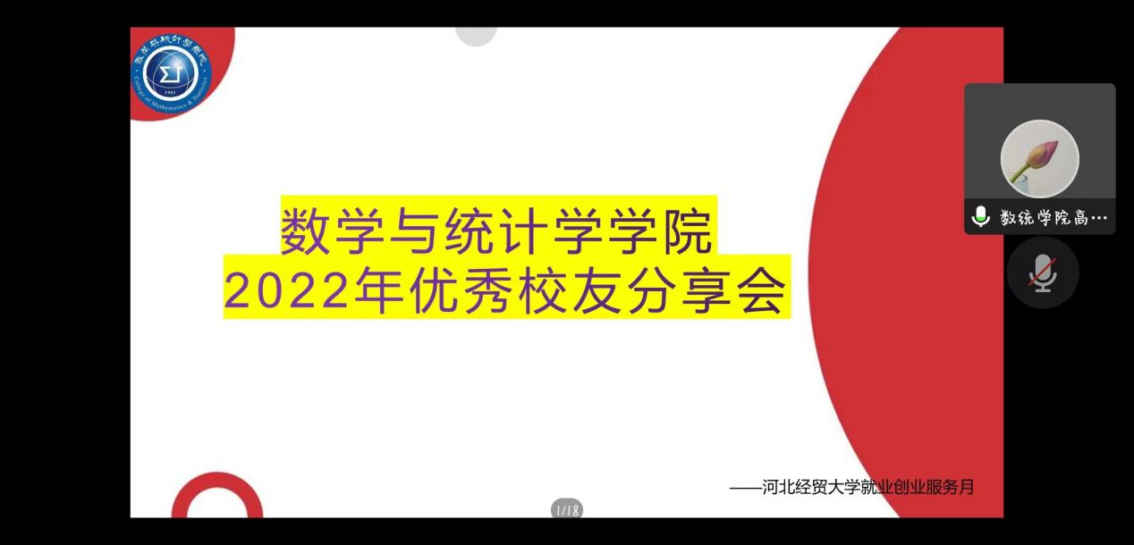 11月7日晚,数学与统计学学院以腾讯会议方式举行2022年优秀校友就业分享会。分享会由院学生会就创部主办,学工办主任高会颖老师主持,优秀校友刘华玮、袁祐琪作为受邀嘉宾与大家分享自己的就业感悟,大一大二全体同学参加。