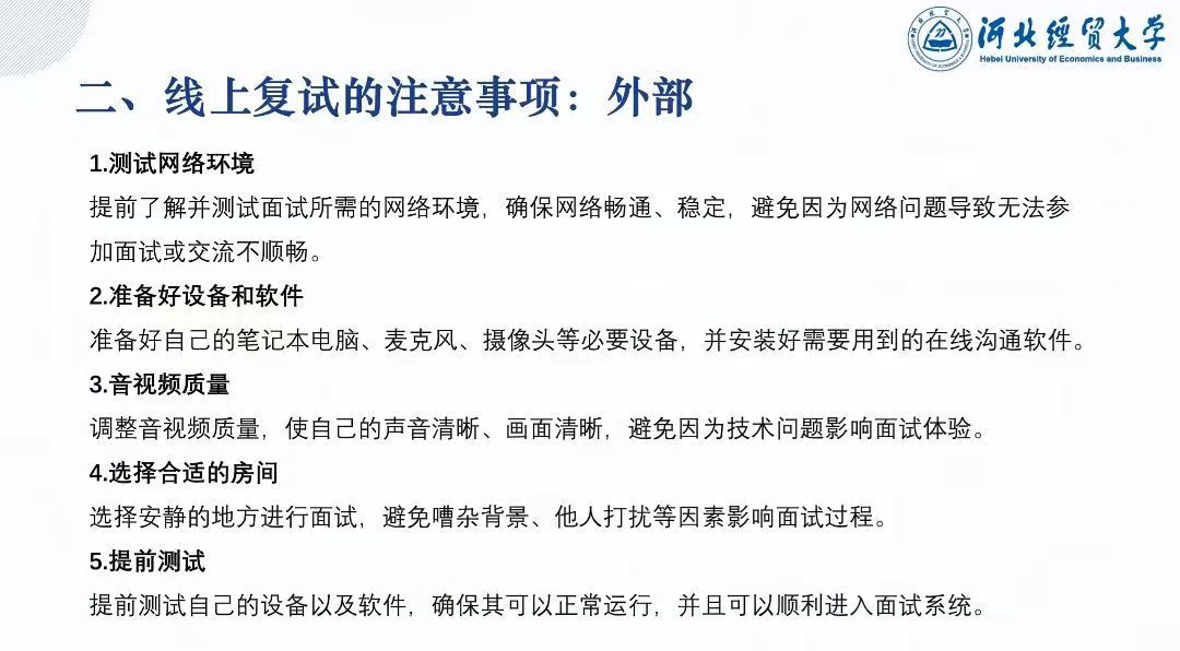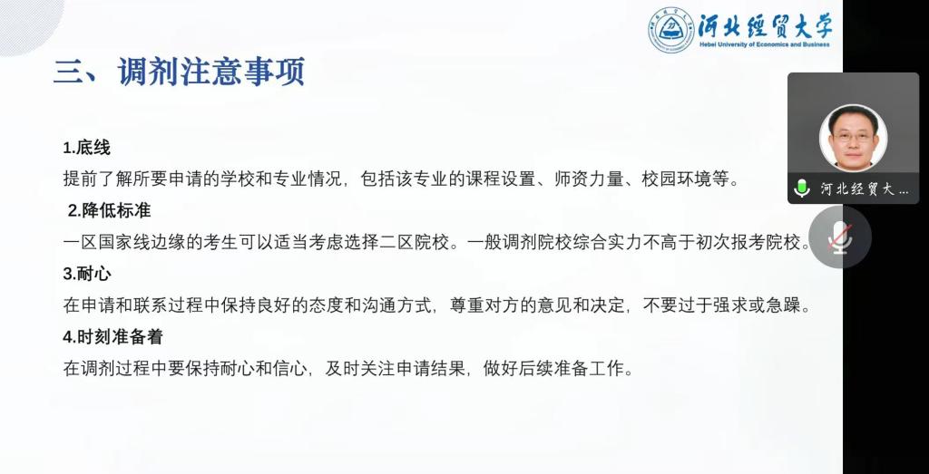 首先,他详细介绍了复试内容,考生应将重点放在中英文自我介绍、专业英语以及专业能力的准备上。接着,他谈到了一些线上复试和线下复试的注意事项,以帮助同学们应对参加复试时的一些突发情况。他表示,考研调剂考验同学们的耐心,希望同学们在有限的时间内,通过校内校外信息渠道收集更多调剂信息。最后,他耐心地解答了同学们提出的问题。