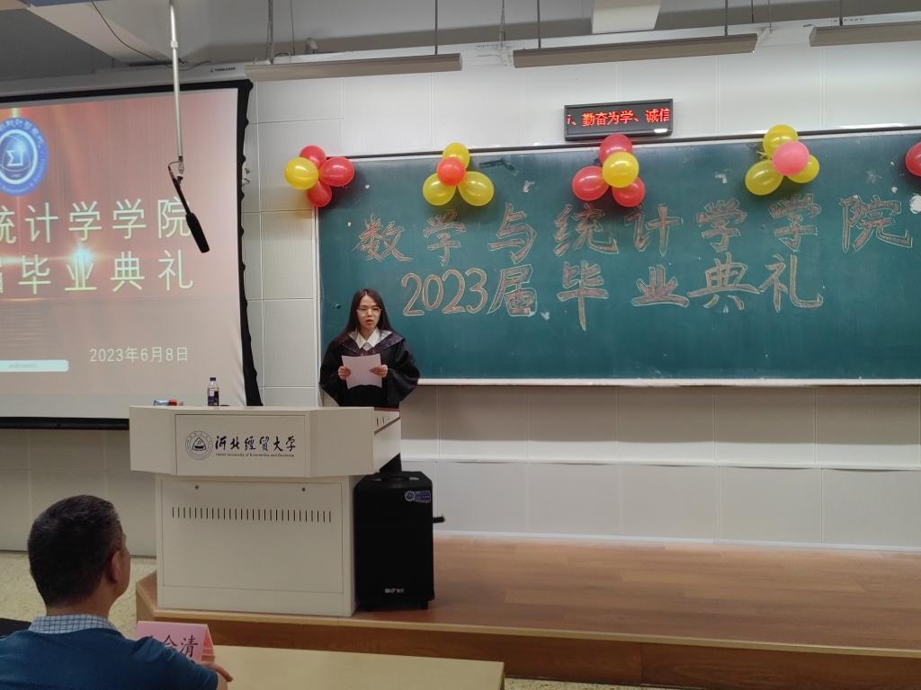 2023届毕业生代表王洋同学在发言中深情感恩母校,表示将永远怀数统学子的初心和梦想,为推动社会发展,实现人民美好生活向往谱写奋斗华章。