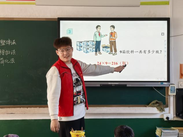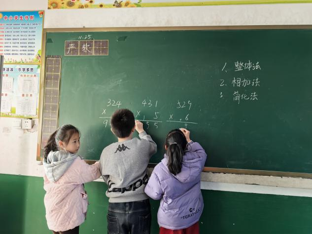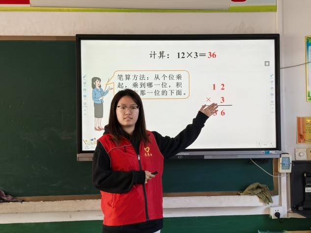 在口算和笔算环节,志愿者们通过小棒摆一摆、加法转化等直观的方式,帮助孩子们理解乘法的本质,掌握口算和笔算的技巧。他们详细讲解了两位数乘一位数的多种口算方法,以及两、三位数乘一位数的笔算流程。在志愿者的悉心指导下,孩子们逐渐掌握了这些计算方法。为了鼓励孩子们积极参与,志愿者们还为回答正确的孩子发放了可爱的贴纸,现场气氛热烈而活泼。