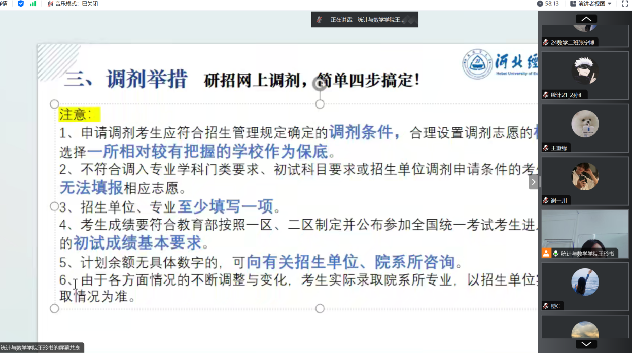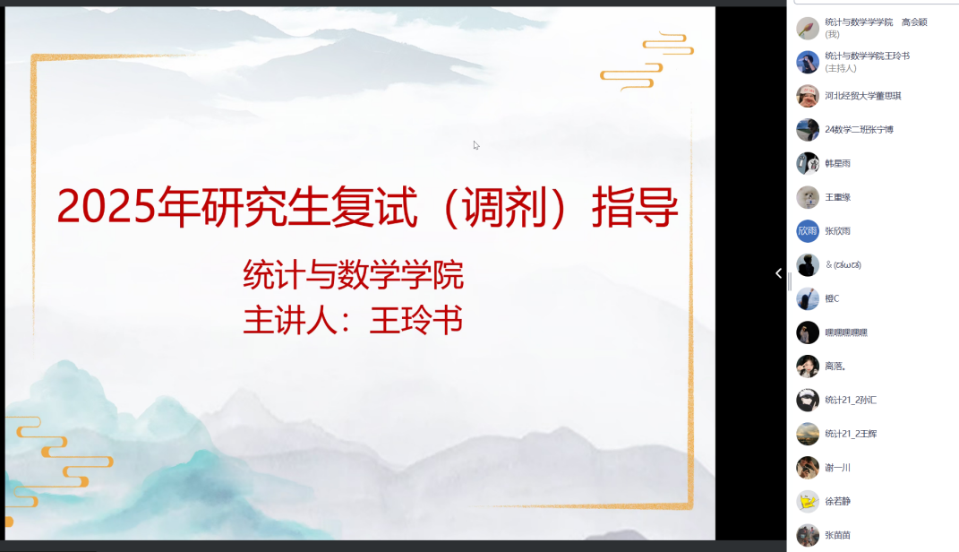 3月10日,世界杯体育官方网站召开“2025年研究生复试(调剂)指导会”线上会议,由学院副院长王玲书主讲,2021级考研学生参加。
