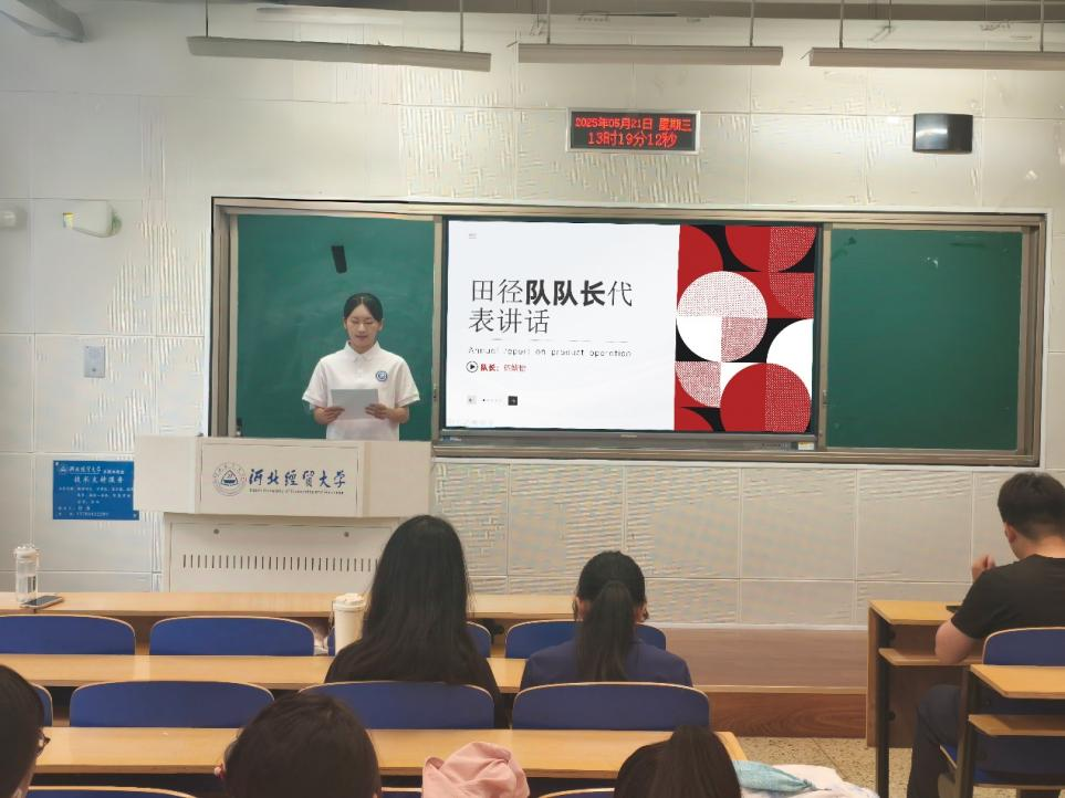颁奖环节结束后,院田径队成立大会开始。王洋老师向大家介绍了田径队成立的重要意义,为这支充满朝气与活力的队伍送上美好祝愿。田径队队长伍婧怡也分享了自己对田径运动的热爱与憧憬,表达了刻苦训练、为校争光的强烈愿望。