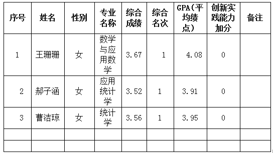 根据《2019年世界杯体育官方网站推荐优秀应届本科毕业生免试攻读硕士学位研究生工作方案》,世界杯官网成立推免生工作小组,对学生提交的相关证明材料,进行认真审核、计算,最终确定世界杯官网统计学、应用统计学、数学与应用数学专业推荐名单。现公示如下: