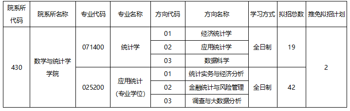 2024年全日制研究生拟招生61人,其中,统计学学术硕士19人,应用统计专业硕士42人(拟招人数含拟接收推荐免试生人数,最终招生计划以国家下达的指标为准。)