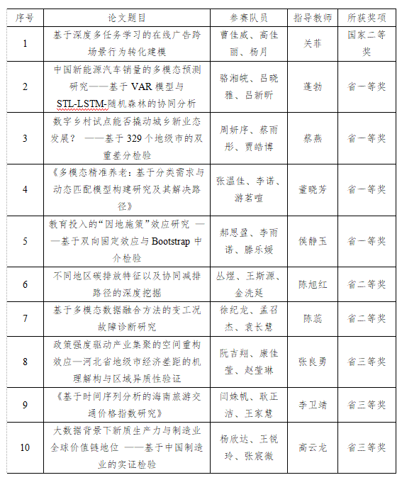 2025年(第十一届)全国大学生统计建模大赛自2月开赛以来,全国共有30941支队伍提交论文参赛,评出891支队伍入围国赛,经国赛通讯评审、现场会议评审和现场答辩赛角逐,最终评选出一等奖90支,二等奖178支,三等奖617支。世界杯官网学生共有30支队伍参赛,最终获得国家二等奖1项、省级一等奖4项、省级二等奖2项、省级三等奖7项。获奖名单如下: