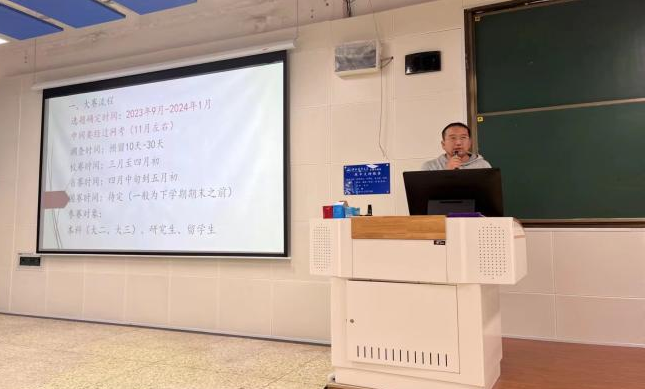 接着,优秀指导教师申博老师从选题确定到国赛时间向同学们介绍了市调大赛流程,鼓励同学们积极报名该赛事,踊跃参与,强调了比赛期间的注意事项,并就大赛需要掌握的相关知识作出解释。